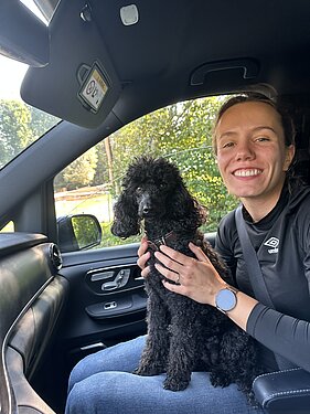 Bella ist nie schlecht gelaunt und der Herzenshund der Praxis. Sie tröstet die Pferdebesitzer und lenkt uns ab, wenn die Gedanken kreisen. Sie ist einfach toll